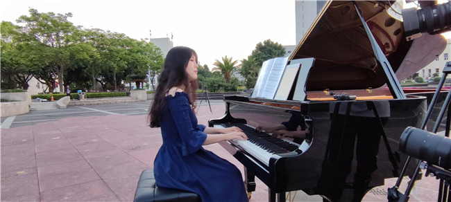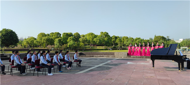 《国旗颂》是原创歌剧《五星红旗》的主题曲,该部歌剧讲述了少妇白洁 校友、国旗设计者曾联松设计五星红旗的故事,反映浙江青年将个人情感抉择与家国命运紧密相连,颂扬勇于担当、矢志不渝的革命精神与爱国情怀。国旗广场上,雄伟的五星红旗雕塑成为本期音乐党课最好的背景。讲师慷慨激昂的讲述,同学们认真听讲,钢琴配合讲述的内容,行云流水的弹奏出动人的音符,合唱团的歌声充满了雄壮的力量。现场氛围庄严而热烈。