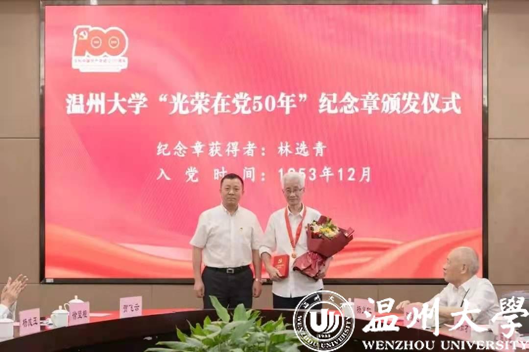 校党委书记谢树华逐一为老党员颁发“光荣在党50年”纪念章,并与他们亲切握手、真挚慰问,表达对老党员的崇高敬意。他希望学校各级党组织和广大党员以纪念章颁发为契机,深入推进党史学习教育,持续掀起向老党员学习的热潮,主动向先进看齐、向榜样看齐,在学校高质量发展新征程中,担当作为、奋发奋进、出力出彩。青年学生党员向老党员献上鲜花,现场响起阵阵热烈的掌声。老党员们手捧纪念章,心潮澎湃、百感交集,自豪之情溢于言表。