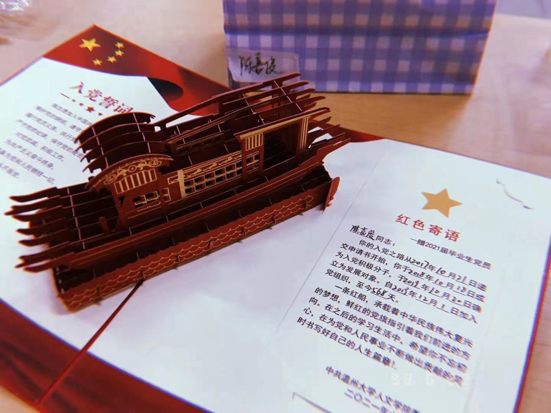 “这个纪念卡片好精致,入党誓词、立体纸塑红船,还有入党历程。”