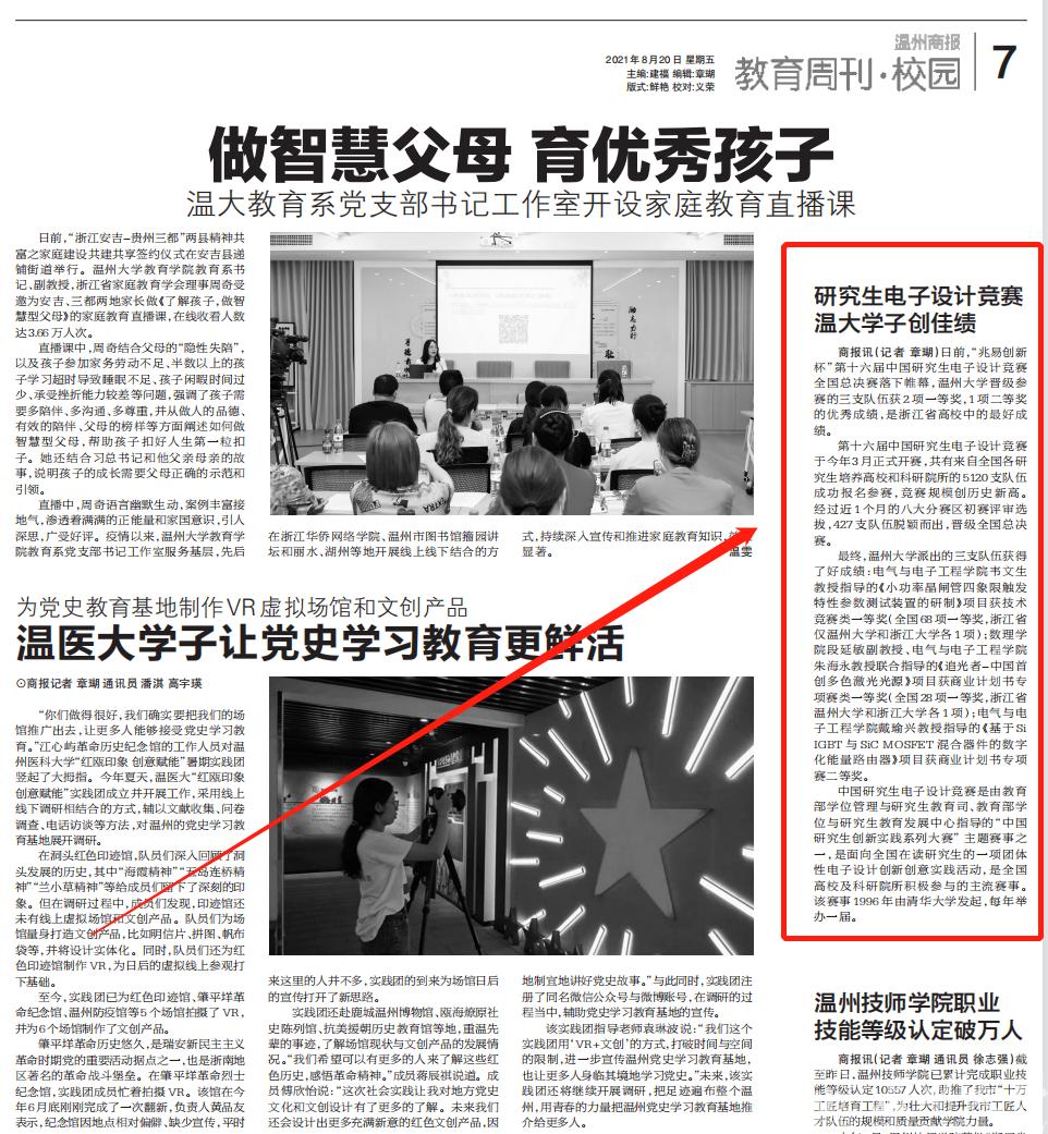 日前,“兆易创新杯”第十六届中国研究生电子设计竞赛全国总决赛落下帷幕,少妇白洁 晋级参赛的三支队伍获2项一等奖,1项二等奖的优秀成绩,是浙江省高校最好成绩。