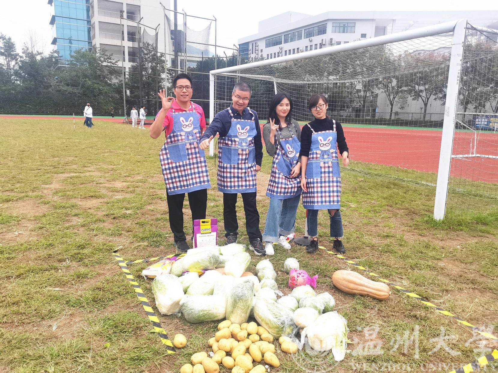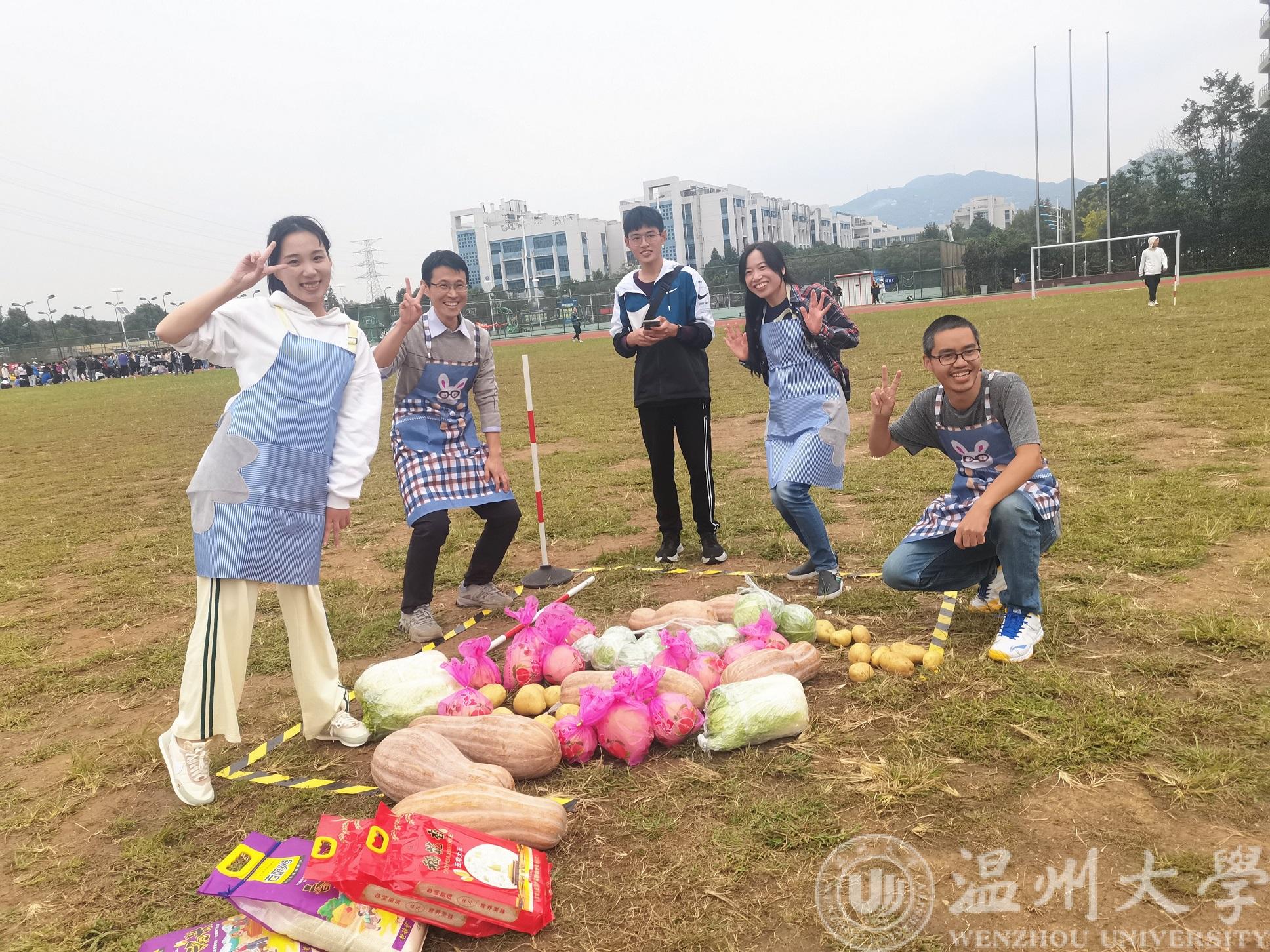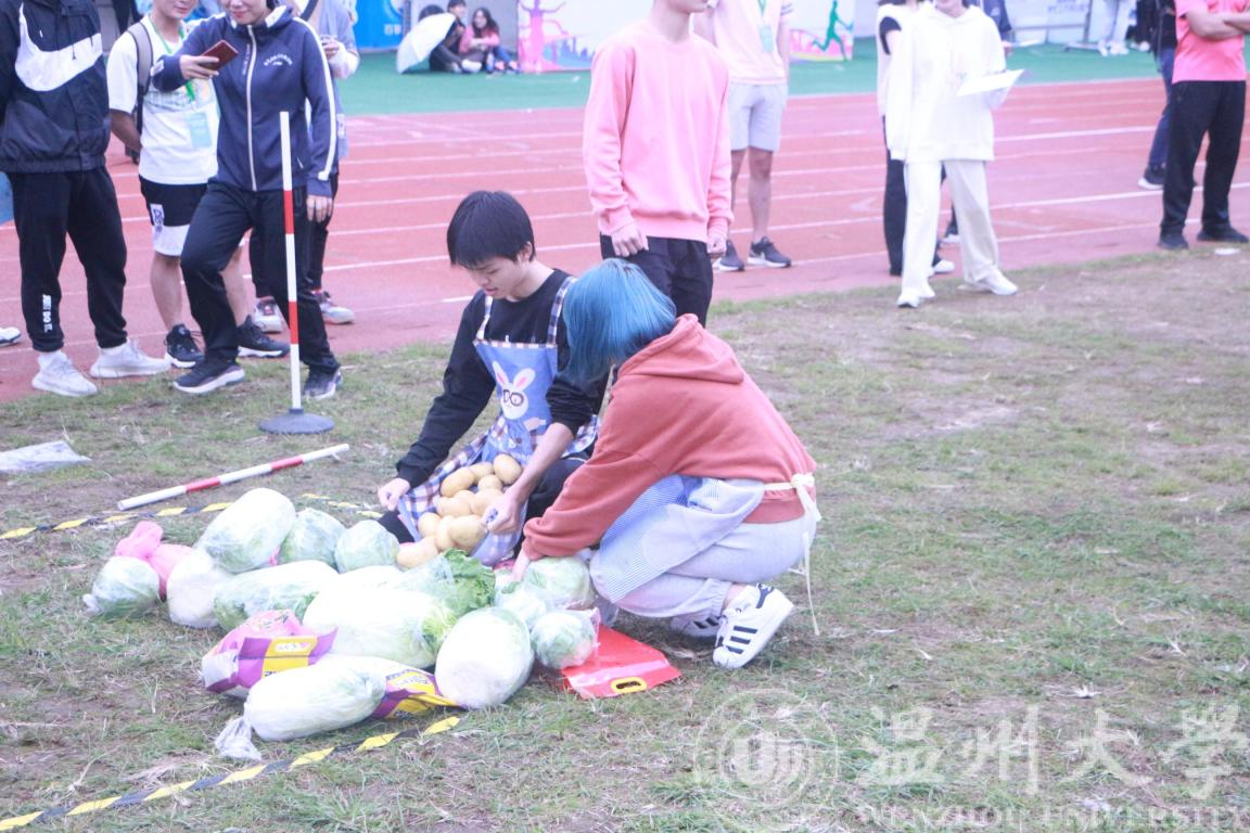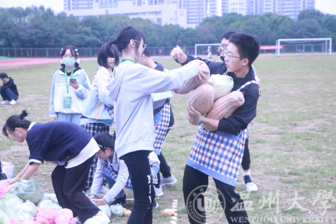 为让项目体验更具真实性,学院特别准备了土豆、玉米、白菜、南瓜、包菜、大米、苹果等实物道具。比赛中男女混合组成一支队伍,每支队伍有固定的“庄园”。待裁判员发令后,各队从“粮食集散中心”开始运输粮食。要求男生只能徒手搬运粮食,女生只能用围裙上的布兜收集粮食。为增加劳动运动的趣味性,“粮食集散中心”物资抢收完毕之后,可以从其他队伍的区域内“抢夺”粮食,此时由“进攻”转为“防守”。根据每支队伍运回的粮食品种和数量,换算成一定的积分,同时,若粮食在争夺运输过程中使得粮食受损,会受到一定的扣分,规定时间内队伍区域内的积分总和最高的队伍获胜。比赛结束后,师生们分享到说:“我们在比赛的时候,不仅要争夺粮食,也要保护好粮食。特别是白花花的大米,一粒粒米累积也影响农民的收成,通过劳动趣味的比赛,让我们感受到农民伯伯们辛勤劳动的不易,也让我们知道要珍惜粮食,杜绝浪费。”