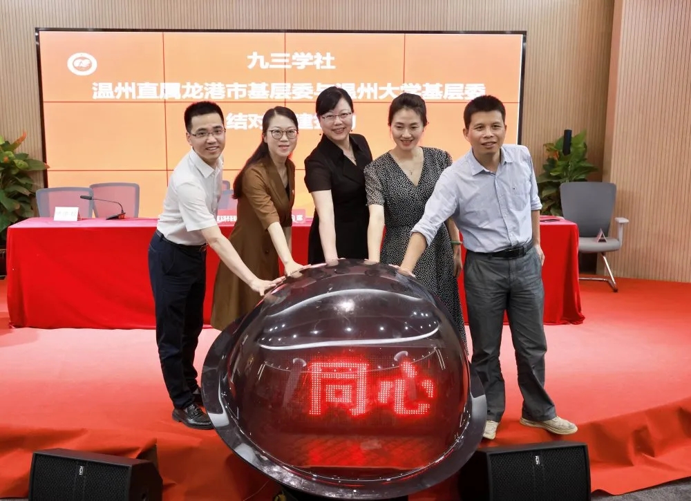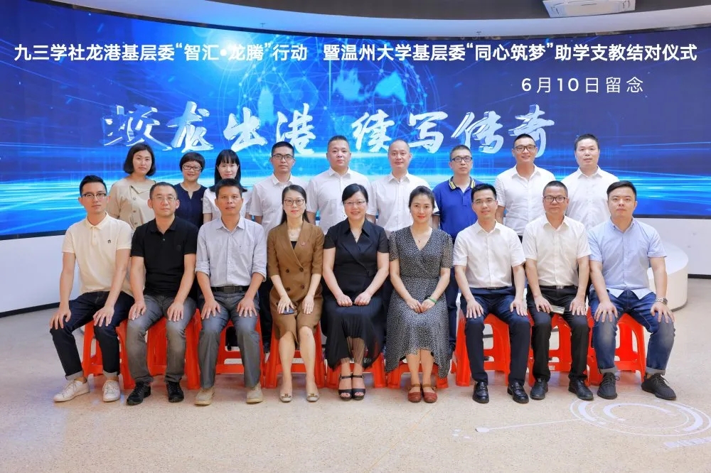 仪式上,九三学社温州直属龙港市基层委与九三学社少妇白洁 基层委结对共建签约,并为“同心筑梦”助学支教行动和龙港九三“智汇·龙腾”行动授牌。