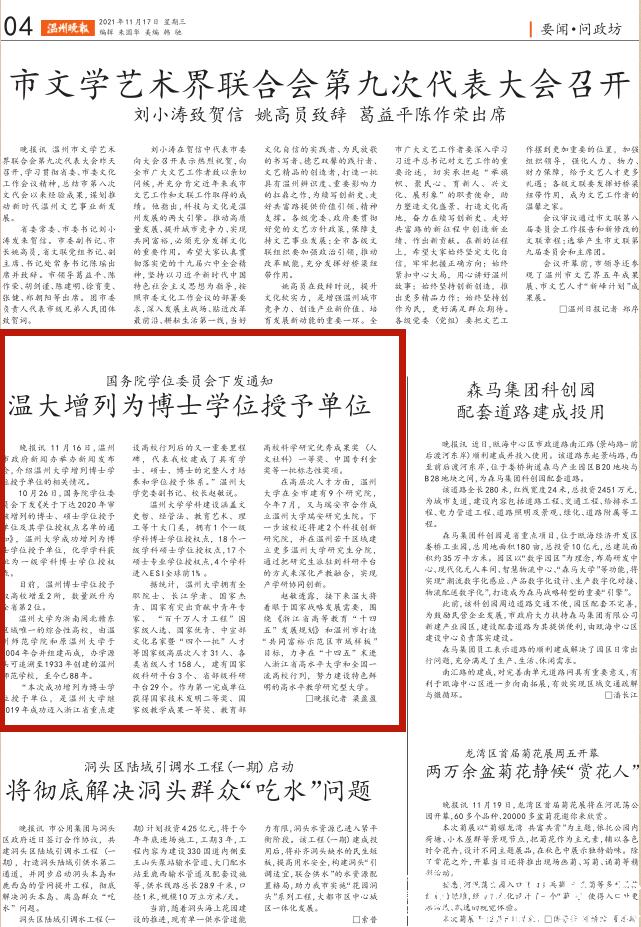 目前,温州博士学位授予权高校增至2 所,数量跃升为全省第2位。