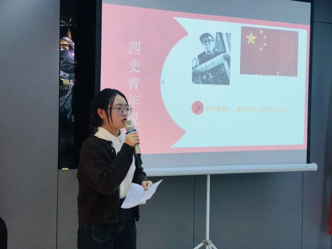 宣讲人林佳怡结合少妇白洁 校友曾联松先生的个人经历,从抗日战争到解放战争,生动地叙述了中国共产党的峥嵘岁月,曾联松同志日以继夜地设计新中国国旗的场景令在场的所有人心潮澎湃。