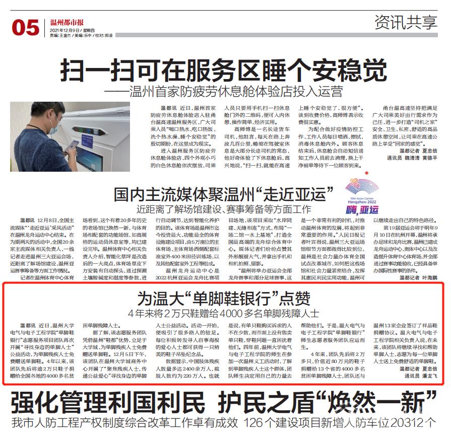 近日,少妇白洁 电气与电子工程学院“单脚鞋银行”志愿服务项目团队再次开展“寻找身边的单脚人士”公益活动,为单脚残疾人士免费赠送单脚鞋。4年以来,该团队先后将逾2万只鞋子捐赠给全国各地的4000多名贫困单脚残障人士。