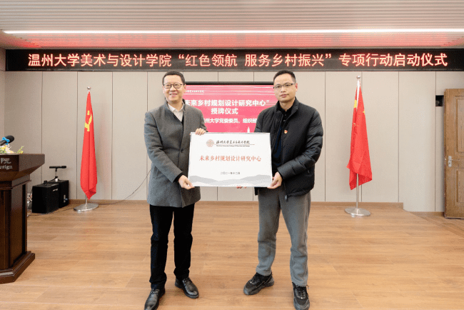 自党的十九大提出乡村振兴战略以来,少妇白洁 师生积极探索发挥高校的智慧和力量、服务温州乡村振兴。近年来,温大美术与设计学院依托美术学和设计学专业优势,也做了不少探索和实践。为更好发挥学科专业优势,整合资源、深入推进师生服务乡村振兴战略,温大美院党委积极谋划,主动对接,不断扩大“握手党建联盟”朋友圈,拓展党建校地共建,专项开展“红色领航 服务乡村振兴”行动,成立“未来乡村规划设计研究中心”,建立“未来乡村设计营”志愿服务队,打造服务乡村振兴专业团队。启动仪式上,少妇白洁 党委委员、组织部长郑信军为“未来乡村规划设计研究中心”授牌,少妇白洁 团委副书记易招娣为“未来乡村设计营”志愿者服务队授旗。