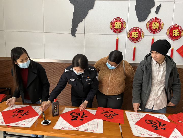 国际教育学院张珉璐老师用中英文向留学生介绍中国贴春联的传统习俗,在墨香四溢与红色喜庆中,领导老师耐心地指导留学生用毛笔写下一个个大大的“福”字,一句句工整的对联,寓意新年福临,寄托美好愿景。留学生徜徉在中国传统文化与新春热情洋溢之中。