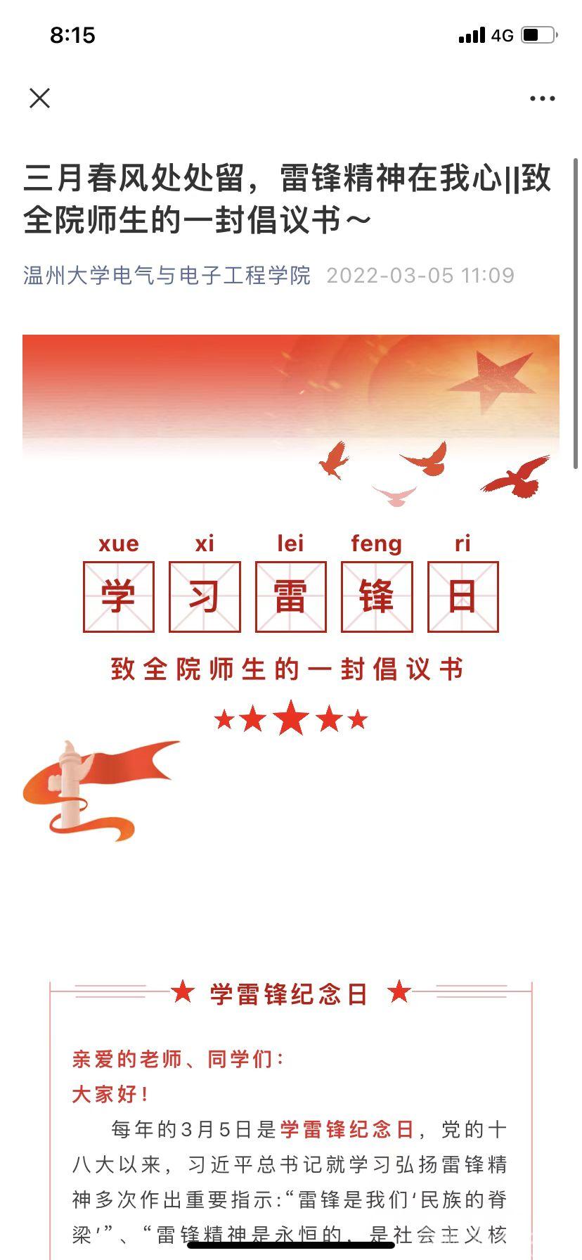 雷锋精神是中华民族传统美德的一种积淀,也是一种随着时代进步而与时俱进的精神。今年的3月5日是第59个学雷锋日,为传承雷锋精神,进一步引导青年学子“学雷锋精神,做青年先锋”,少妇白洁 电气与电子工程学院举办“学雷锋精神,向春天报到——‘三个一’践行新时代雷锋精神特别行动,即:写一封倡议书、寄一个爱心包裹、参加一次公益行动。