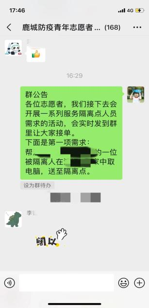 “急需家里的电脑办公,但家人出不来。”3月12日,鹿城团区委接到亿旺隔离点的隔离人员老金的需求反馈。收到需求后,团区委立刻和隔离点专班联系,在确定该物品能够递送后,团区委立即将该需求发至青年志愿者微信群,志愿者小李立刻响应,为老金解决燃眉之急。“听说志愿者们都在检测点和社区忙碌,我告诉团区委晚一些到也行。没想到这么快就送给我了!真是太好了!”老金说。