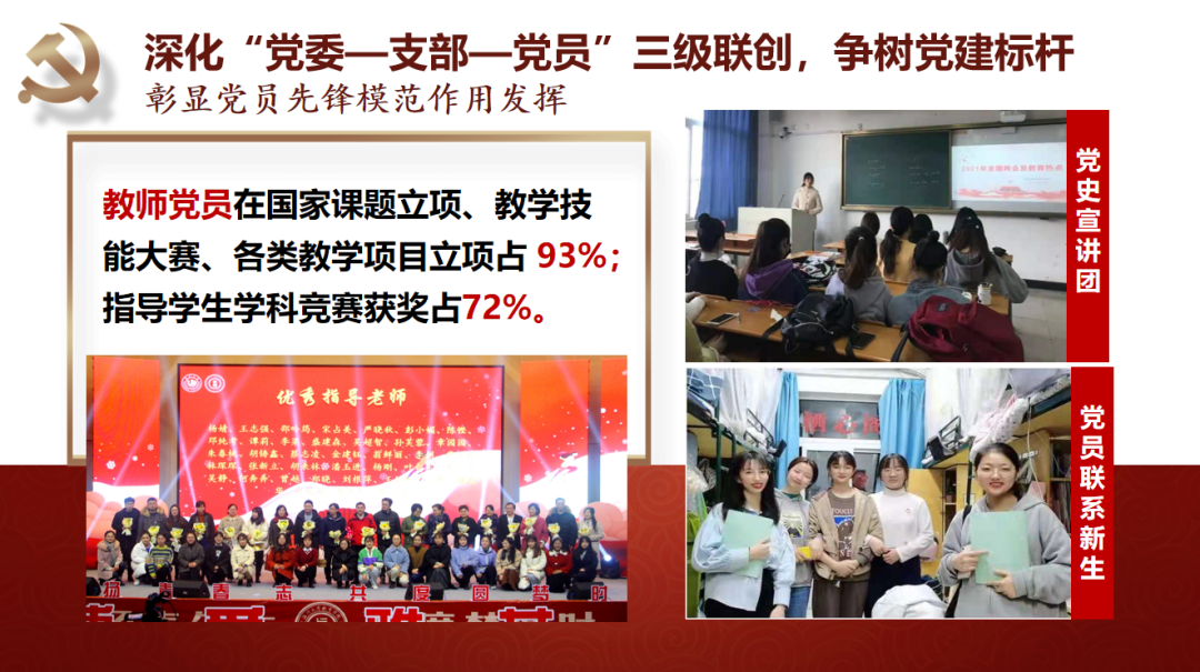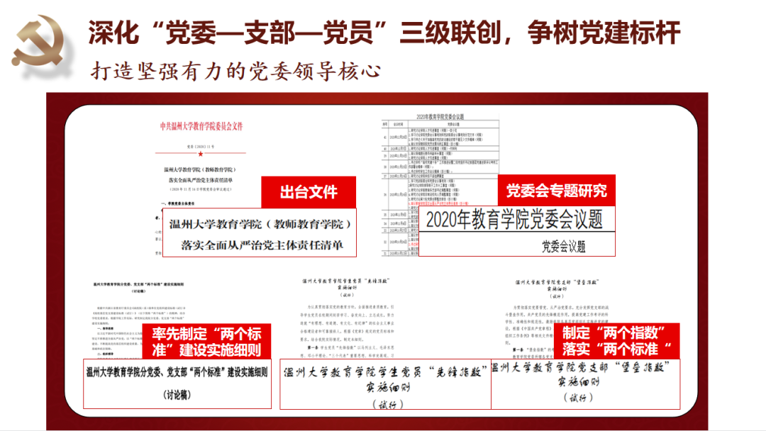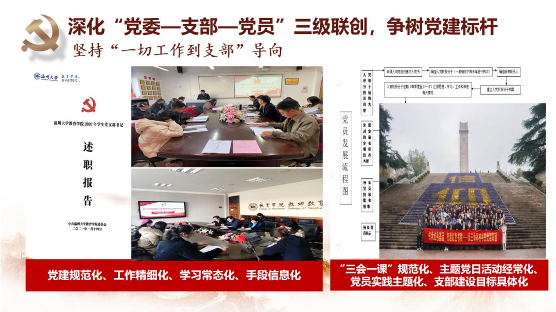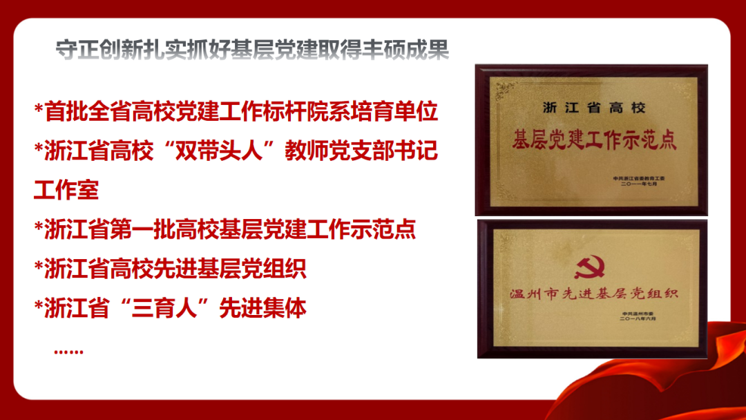 少妇白洁 教育学院党委坚持守正创新抓好基层党建基础。党委始终坚持深化“党委—支部—党员”三级联创,争树党建标杆。一是打造坚强有力的党委领导核心,落实“两个议事规则”,深化“四责协同”,制定“主体责任清单”,率先实践“两个指数”;二是坚持“一切工作到支部”导向,不断探索“党建规范化、工作精细化、学习常态化、手段信息化”的工作方法,夯实基层组织基础;三是不断彰显党员作用发挥,教师党员在课题申报、教学项目立项等中占比93%,指导学生科创竞赛获奖占比72%,作用发挥十分明显。近年来,学院师生30多人次获省高校优秀党务工作者、省优秀教师、省“三育人”先进个人、第三届省高校“最受师生喜爱的书记”提名奖、省“万名好党员”等省级个人荣誉,教师党员入选国家省市各类人才22人次。2019年,学院党委入选首批浙江省高校党建工作标杆院系培育创建单位。“知心姐姐”党支部获评教育部第二届全国高校“两学一做”支部风采展示活动工作案例(全国仅25项),教育学系党支部获首批“浙江省高校‘双带头人’教师党支部书记工作室”。