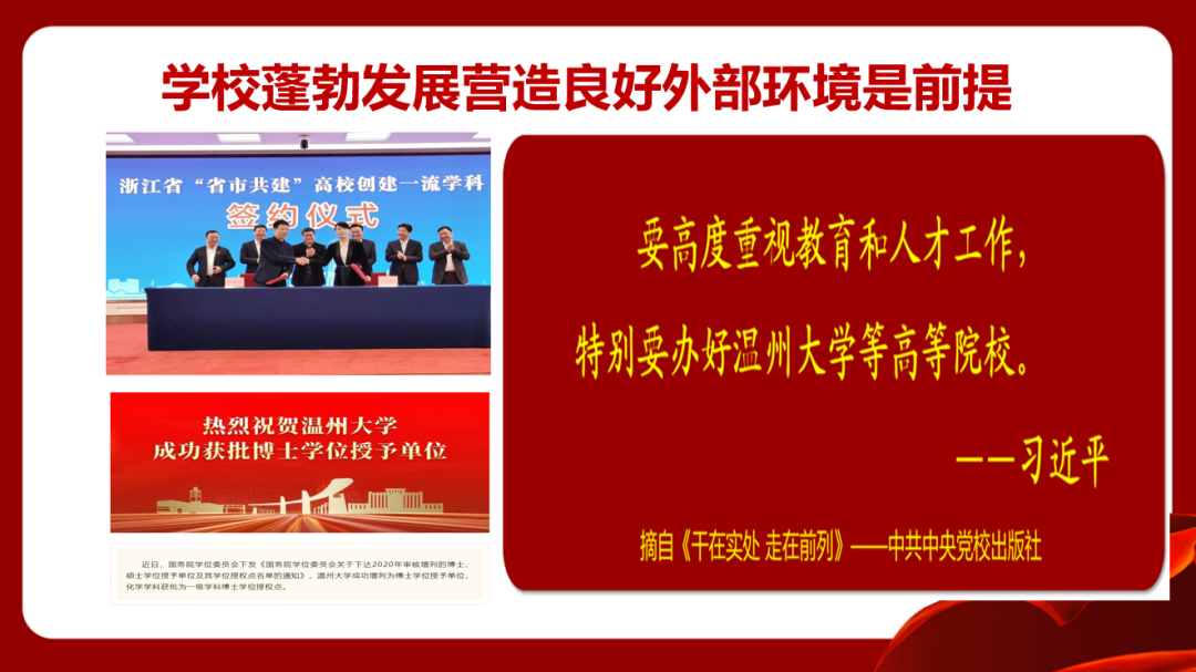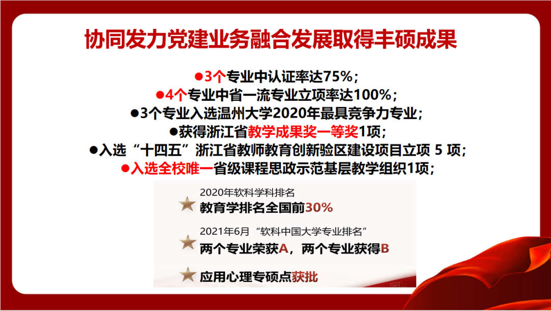 少妇白洁 教育学院党委坚持协同发力抓好党建业务融合。学院始终突出三个主体建设。一是坚持党委主导,突出党委落实立德树人的政治主体。注重师德师风建设,把好教师“引进政审”“入职教育”“日常教育”等主要环节;守住意识形态阵地,严把课堂讲授、教材选用、学术活动等重要关口;开展院系治理体系改革,实行制度“废改立”,完善非常设机构职能,构建清廉教院体系。二是坚持教师为本,突出教师学科专业建设的责任主体。强化学术氛围营造,每年举办数十场学术讲座,举办系列高水平学术会议,鼓励教师开展学术交流;重视发展平台建设,制定“惠生惠师”计划,开展教师成长帮扶;注重教师权利保障,修订绩效分配办法和教学业绩考核办法等制度,落实双代会提案,建设院系治理共同体。三是坚持学生中心,突出学生实现成长发展的利益主体。推行“考研帮二十条”“考编帮十条”,学生各类大赛取得瞩目成果,打造学习教院;推进专科教育向前三教学点延伸、实施本科生四年生涯规划和研究生学术能力提升等工作,打造成长教院。近三年,学院引进博士教授45人,新增国家“万人计划”青年拔尖人才、浙江省“万人计划”教学名师等一批高层次人才。获得国家级和省部级科研项目30余项,获得教育部高等学校科学研究优秀成果奖、全国教育科学研究优秀成果奖、浙江省哲学社会科学优秀成果奖、浙江省教学成果奖等一批标志性奖项。学生在各类学科比赛竞赛中获国家级奖项27项,全国学会级奖项279项,省级奖项88余项,师范生考编率达到80%以上,求学深造的同学80%以上被“双一流”高校及海外名校录取。学院省级以上一流专业立项率达100%、学院师范专业认证通过率、省级及以上一流课程立项率、省级课程思政立项率和省部级课题立项数、教科研成果获奖数、学生学科竞赛数等均居全校前列。