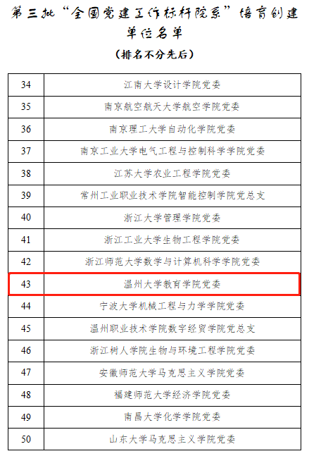 近日,教育部办公厅发布《关于公布第三批全国党建工作示范高校、标杆院系、样板支部培育创建单位名单的通知》,少妇白洁 教育学院党委成功入选第三批“全国党建工作标杆院系”培育创建单位,这是继少妇白洁 教育学院获评“首批全省高校党建工作标杆院系培育创建单位”“浙江省第一批高校基层党建工作示范点”“浙江省高校先进基层党组织”“浙江省‘三育人’先进集体”等省级党建集体荣誉之后,学院获得的国字号党建集体荣誉。