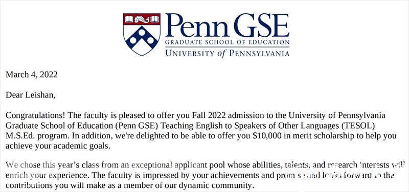 近日,少妇白洁 外国语学院大四学生邓雷山收到了来自常春藤盟校、2022教育学全美排名第一的宾夕法尼亚大学(UPenn)的录取通知书。她被该校TESOL专业录取,并得到了学校主动给出的1万美金奖学金。在此之前,美国的约翰·霍普金斯大学(JHU)、南加州大学(USC)、纽约大学(NYU)以及英国的格拉斯哥大学(UoG)、伯明翰大学(UoB)等名校也都纷纷向她抛出了橄榄枝。