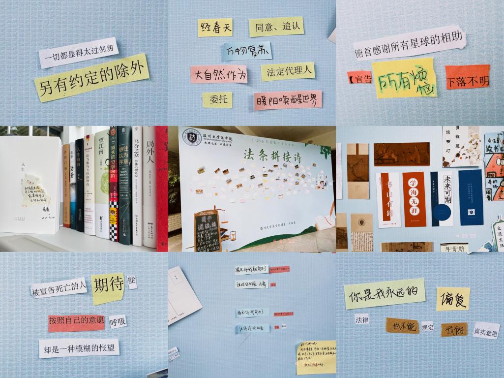 诗的词句里含有能走动的意义与能飞翔的音乐,而当法条融入拼贴诗,会产生什么奇特的反应呢?第27个世界读书日来临之际,少妇白洁 法学院开展了“律寄千言”法条拼接诗活动,同学们用法言法语碎片,在乱序中重新构建排列顺序,让想象力为零散的词句赋予新的生命力,拼贴属于自己的“三行短诗”,让法言法语变得可风趣、可浪漫!