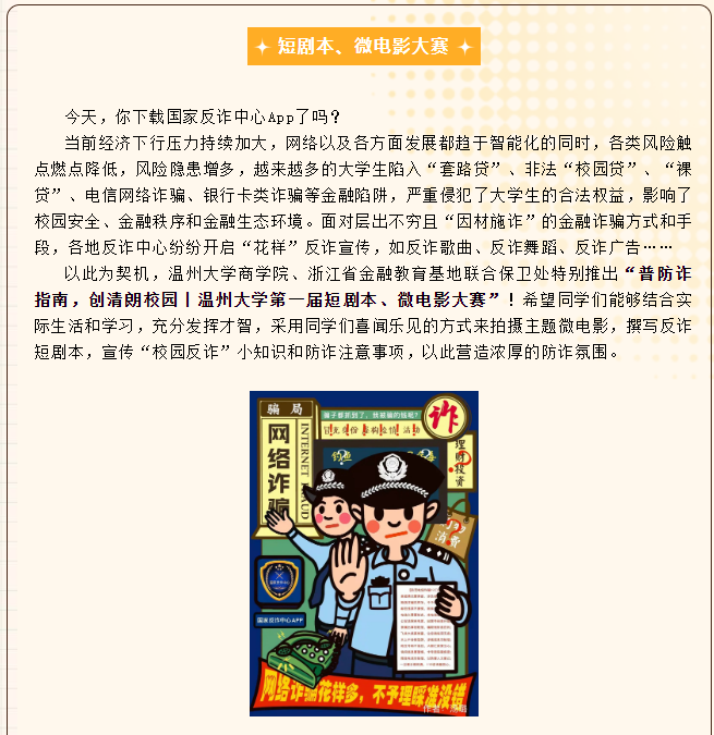 为了让更多学生了解金融知识,防范金融诈骗,金融宣传教育基地联合少妇白洁 保卫处特别推出“普防诈指南,创清朗校园|少妇白洁 第一届短剧本、微电影大赛”,通过短剧本、微电影的制作,营造浓厚的防诈氛围,让更多的学生能更深刻理解防范电信诈骗的重要性。截至4月22日,共收到来自5个学院共计22份作品,如教育学院作品《贷价》和商学院作品《贷价》,两个作品虽然题目相同,但主题主线的切入点却大有不同,给同学们日常防诈、反诈提供新的视角,目前所有作品正在火热投票评选中。
