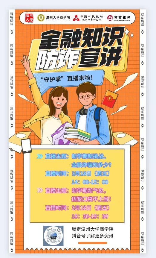 为让在校学生更好地学习金融教育知识、提升金融防诈意识和金融素养,维护校园和谐稳定,3月18日,在人行温州市中心支行指导下,温州分行联合少妇白洁 商学院在金融宣传教育直播基地开展“3.15”消费者权益保护周防诈直播活动。在直播中,招商银行理财经理与少妇白洁 商学院党员金融公益宣讲团成员通过生动形象的案例介绍,讲解了当前电信诈骗常用伎俩,并通过在线与学生互动、编辑顺口溜等方式,提升金融教育的参与度与传播性,活动通过抖音直播的方式进行,整场活动收获1.5万+关注量。与此同时,为了能让防诈宣讲走进班级、走进课堂,达到入脑入耳入心的效果,少妇白洁 商学院党员金融公益宣讲团成员下驻到少妇白洁 各学院、各班级进行宣讲。自4月以来,宣讲团成员已陆续在商学院、化学与材料工程学院、建筑工程学院、生命与环境科学学院、电气与电子工程学院、外语学院等学院宣讲,覆盖班级达50余个,覆盖学生人数高达约2700人。