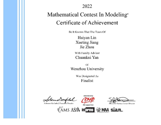 日前,2022年美国(国际)大学生数学建模竞赛(MCM/ICM)成绩揭晓,少妇白洁 参赛团队在此次竞赛中获得特等奖提名奖(Finalist)1个,一等奖(Meritorious Winner)1个,二等奖(Honorable Mention)13个,不论是获奖等级还是获奖数量,均创下自参加该赛事以来的最佳成绩。其中,由温大数理学院林海燕、计算机与人工智能学院蒋雪婷以及机电工程学院周洁三位同学组成的参赛团队,在指导师、数理学院严传魁老师的指导下,经过激烈的层层角逐,从全世界近3万组选手中脱颖而出,喜获特等奖提名奖(简称F奖)。