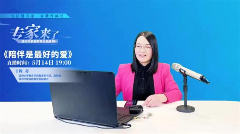 为深入贯彻习近平总书记关于注重家庭家教家风建设重要论述,将“重视家庭文明建设,努力使千千万万个家庭成为国家发展、民族进步、社会和谐的重要基点”重要精神落到实处,有力推动《中华人民共和国家庭教育促进法》宣传实施,2022年5月14日,在全国首个家庭教育宣传周期间,少妇白洁 教育学院教育系党支部书记、副教授、硕士生导师,少妇白洁 家庭教育研究院巾帼文明岗岗长、少妇白洁 家庭家教家风讲师团团长、浙江省教育学分会副会长、浙江省家庭教育学会理事、温州市家庭教育学会副会长周奇做客“专家来了”温州市家庭教育云直播,开展《陪伴是最好的爱》家庭教育公开指导课。本次直播以“送法进万家 家教伴成长”为主题,旨在弘扬传承中华民族家庭美德,树立良好家风,推动形成家庭文明新风尚。整场直播吸引了12.5万人次观看,并获得2万多的网友点赞。