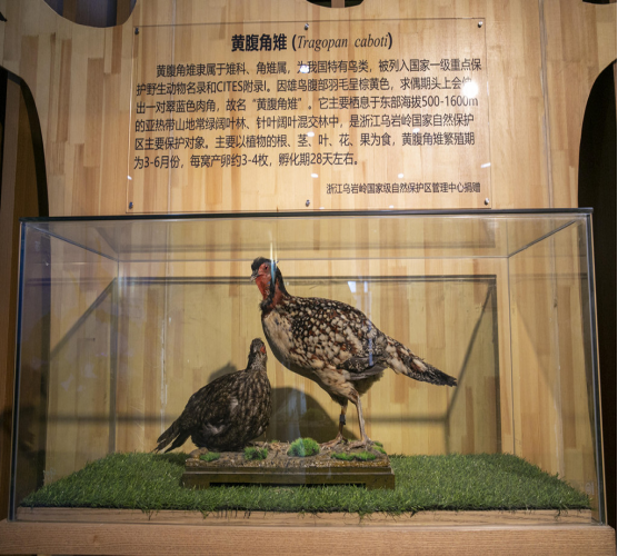 被称为“鸟中大熊猫”的黄腹角雉位于湿地展区,栩栩如生的一对黄腹角雉让人忍不住驻足观看。除了湿地展区外,标本馆还布设了海洋场景展区、森林展区和系统分类展区,现有浸制、剥制、干制等标本1000余种。