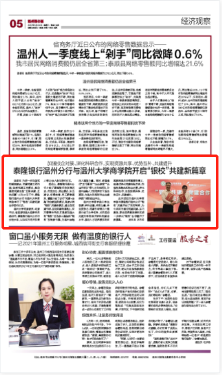 活动上,泰隆银行温州分行介绍了泰隆银行的发展历史、市场定位、商业模式、队伍建设、成绩荣誉、员工薪酬福利,着重介绍了该行“党建+金融”的创新服务模式,高度认同“银校”共建新模式,提出在党建引领、互促共建的道路上,双方要携手并进,打造更加强大的“银校”红色战斗堡垒和“银校”发展新引擎,为温州金融注入蓬勃力量。同时,希望通过“实习基地”“企业课堂”“企业开放日”等人才交流项目,为温州金融人才的培养打下坚实基础,为温大的高校毕业生提供更广阔的就业平台。
