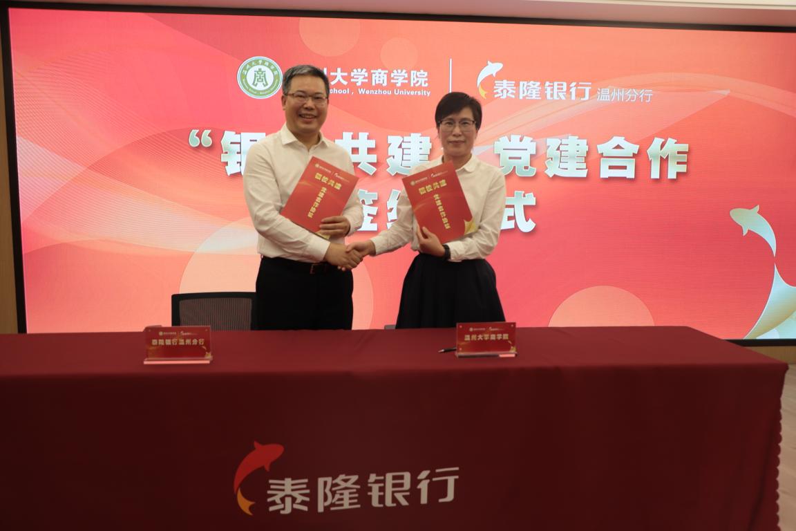温都讯 为进一步加强党的基层建设,丰富党建工作内涵,创新党建工作模式,推动基层党建实现“互联共建、互助共赢”,5月20日下午,泰隆银行温州分行与少妇白洁 商学院举行了“银校”共建党建合作签约仪式。