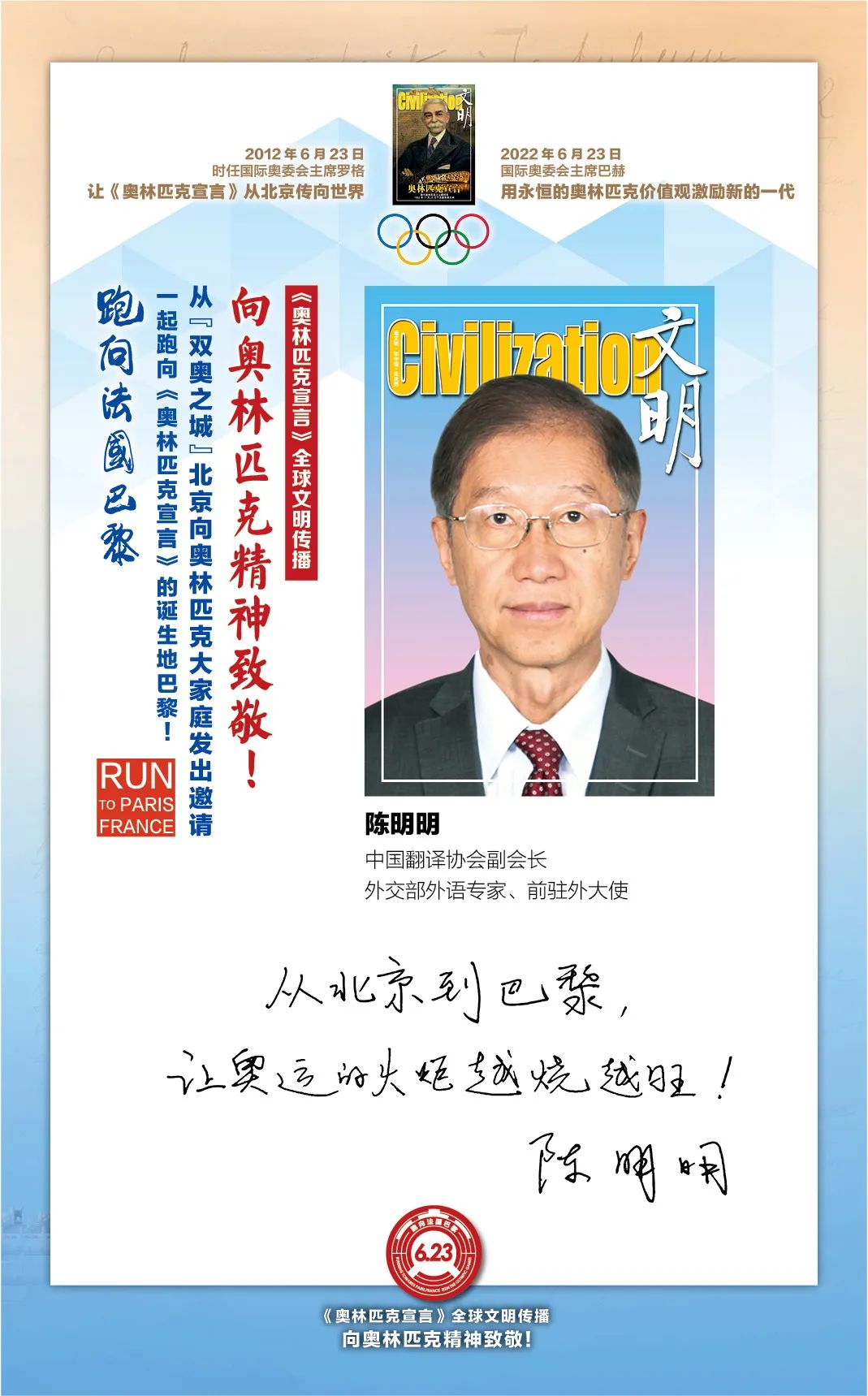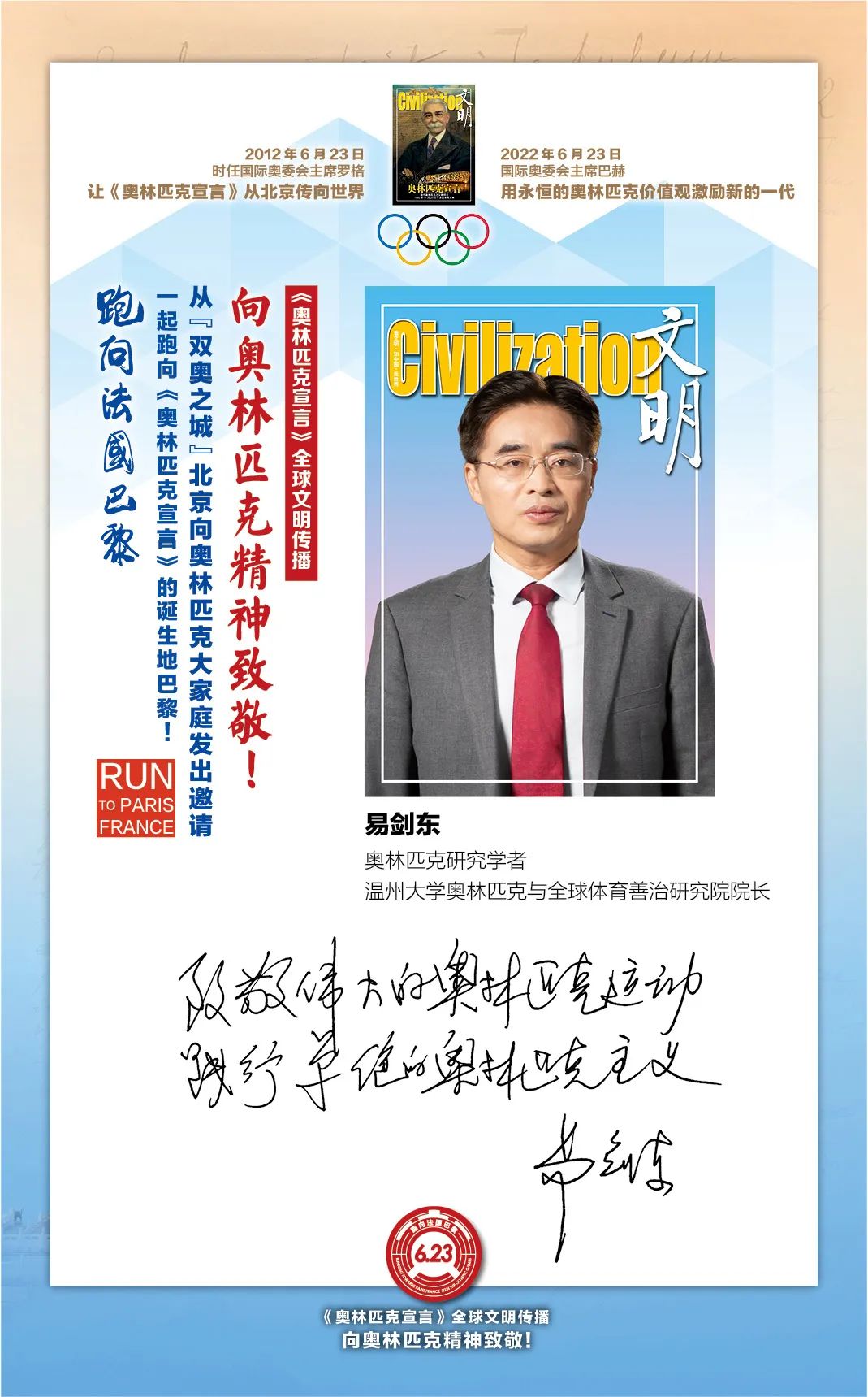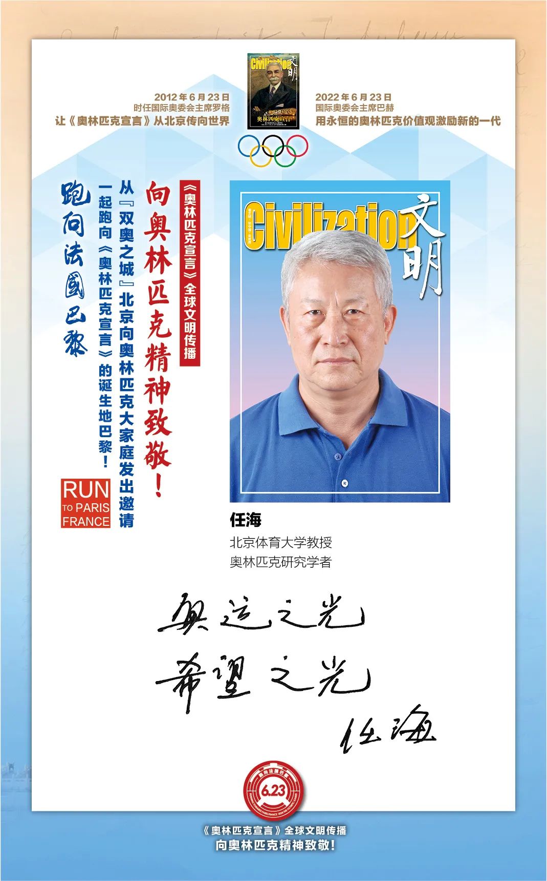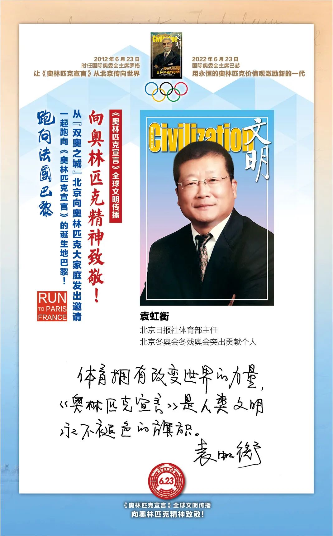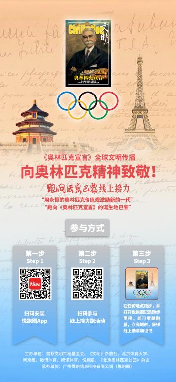 在国际奥委会的指导下,“双奥之城”北京为了促进奥林匹克文化传播和加强中法人文交流,2022年6月23日国际奥林匹克日由首都文明工程基金会和《文明》杂志社联合北京体育大学、新京报、微博体育、腾讯体育、悦跑圈及《北京奥林匹克公园》杂志等有关机构携手推出“《奥林匹克宣言》全球文明传播第四阶段系列活动,让全世界青年携手,跑向法国巴黎:向奥林匹克精神致敬!”