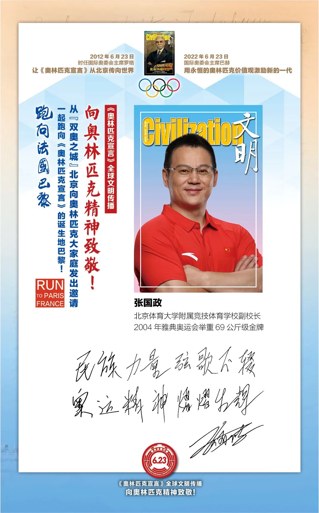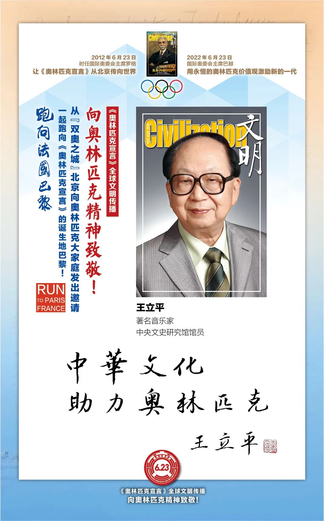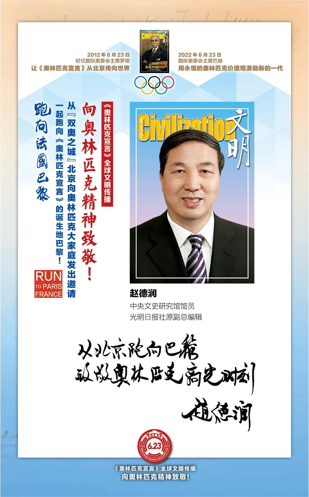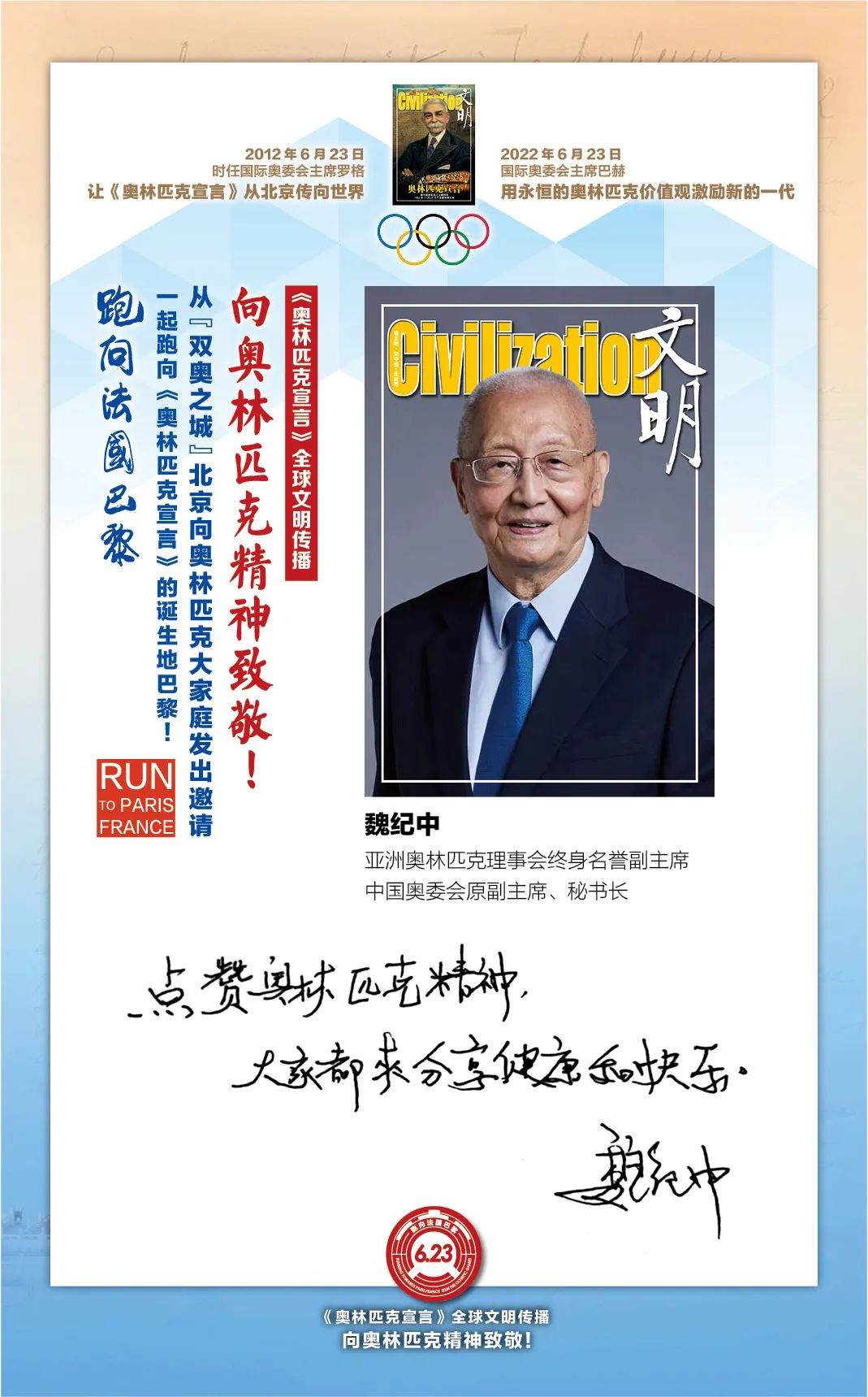在国际奥委会的指导下,“双奥之城”北京为了促进奥林匹克文化传播和加强中法人文交流,2022年6月23日国际奥林匹克日由首都文明工程基金会和《文明》杂志社联合北京体育大学、新京报、微博体育、腾讯体育、悦跑圈及《北京奥林匹克公园》杂志等有关机构携手推出“《奥林匹克宣言》全球文明传播第四阶段系列活动,让全世界青年携手,跑向法国巴黎:向奥林匹克精神致敬!”