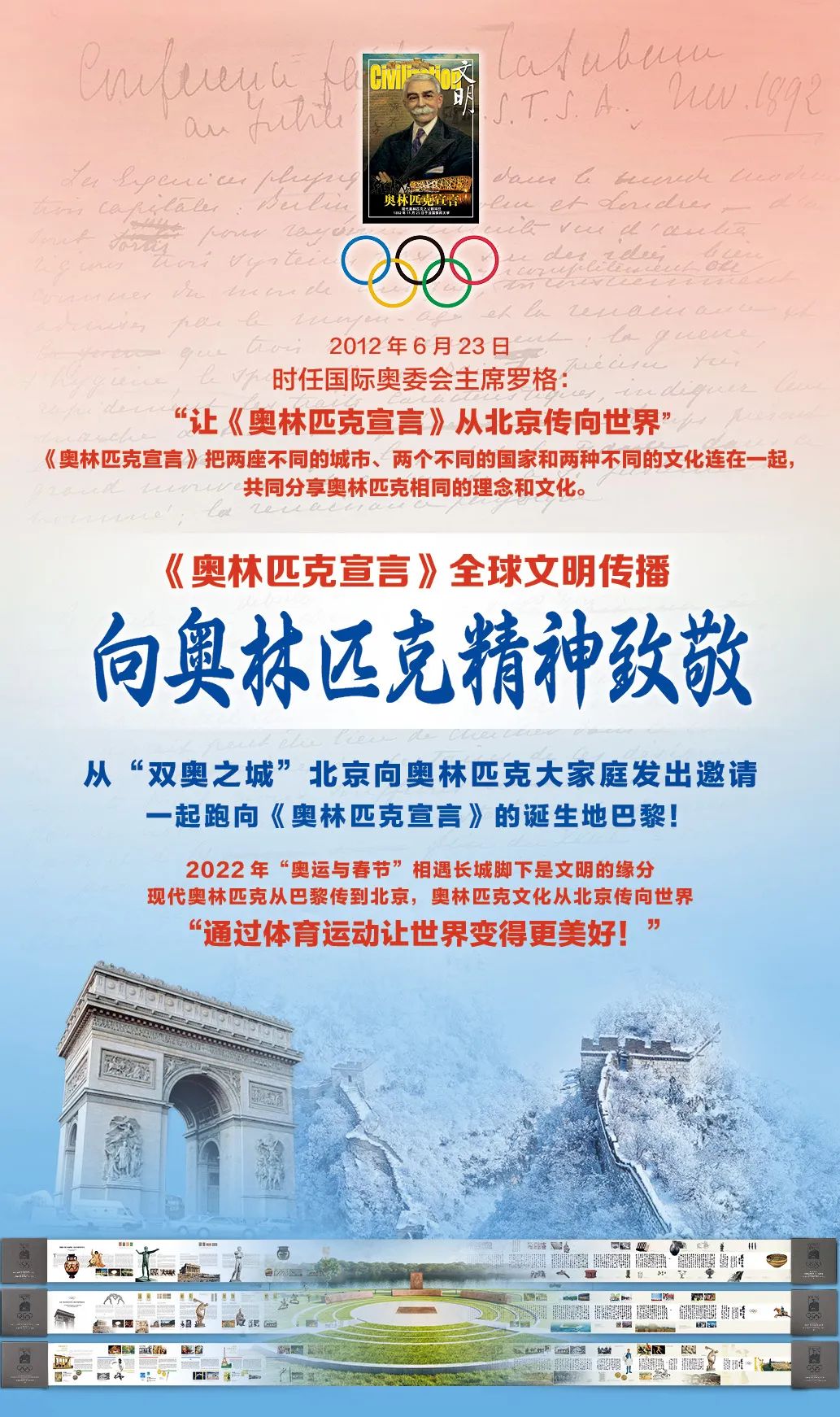2012年6月23日奥林匹克日,是国际奥林匹克文化传播的重要里程碑:世界第一个“奥林匹克宣言广场”在北京建成、连接奥林匹克大家庭的纽带“《奥林匹克宣言》——美丽的奥林匹克文化长卷Ⅰ”在北京推出、“《奥林匹克宣言》全球文明传播”在北京启动。