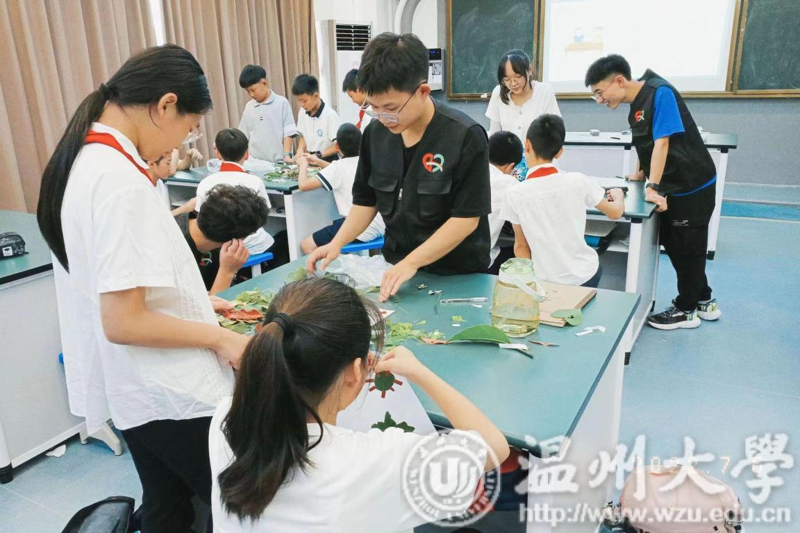 实践锻炼长才干。为了使学生们将环保知识内化于心,外化于行,实践队通过知识竞赛、设计环保徽章等形式将绿色环保理念、节能减排知识融入环保游戏中,寓教于乐,增强学生们的参与度,加强生态文明意识的培养。最后,开设植物创意作画系列活动,以“我心中美丽的祖国”为主题鼓励学生们使用天然树叶作画,在动手体验中激发其对自然的兴趣和对环保的重视,传达心目中对于建设“美丽中国”的理解。