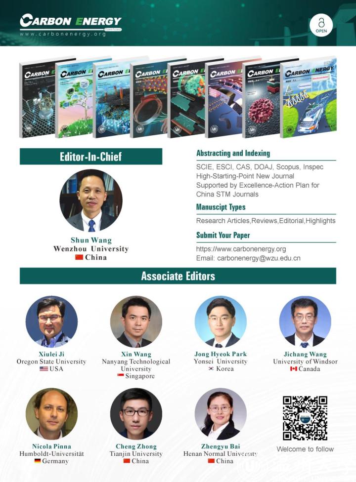 Carbon Energyy在所属的4个细分领域中均顺利跻身Q1分区,其中在化学(物理)领域的163本期刊中,排名第8,位列全球该领域期刊前5%,排名仅次于《自然·材料》《焦耳》《自然·催化》《先进材料》《先进能源材料》等国际顶级期刊,在国产期刊中排名第一;在能源和燃料领域的119本期刊中,排名第7,位列该领域全球期刊前6%,排名仅次于《自然·能源》《能源与环境科学》等国际顶级期刊,在国产期刊中排名第一;在材料科学(多学科)领域的345期刊中,排名第14,位列全球该领域期刊前4%;在纳米科学与纳米技术领域的109本期刊中,排名第6,位列全球前5.5%,实现了历史性的突破。