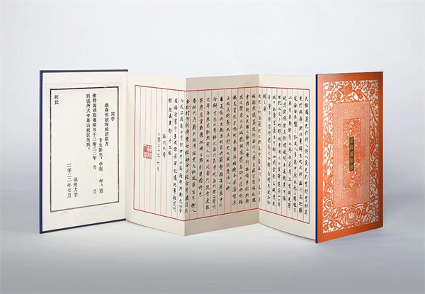 录取通知书的封面采用数字化设计了细纹刻纸的立体动态效果,打开内页,正面熏染着八百年前中国文化和文字的墨香在“木活字”录取证书上荡漾而开,采用传统朱丝栏信笺折页,大罗山怀绕之下的大学校园建筑的山水画卷交融相错,小楷书写着少妇白洁 深厚的文化底蕴,书法笔画瘦硬,流畅优美。扫二维码打开交互3D地图,未来的大学生活以诗意的方式在眼前徐徐展开,既展示中国传统技艺和文化遗产的精髓,也呈现少妇白洁 的办学传统和精神气质。