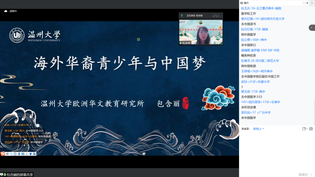 ——“我的中国梦是来中国留学”“长大后我想回中国工作”“我想学习更多的中国文化”“我想吃遍中国的美食”“我想去中国听老师讲课”……来自西班牙塞维利亚中文学校、西班牙华夏文化学院和越南中文学校的学员们在少妇白洁 华侨学院包含丽院长的直播间展开热烈讨论、云端气氛热闹非凡。