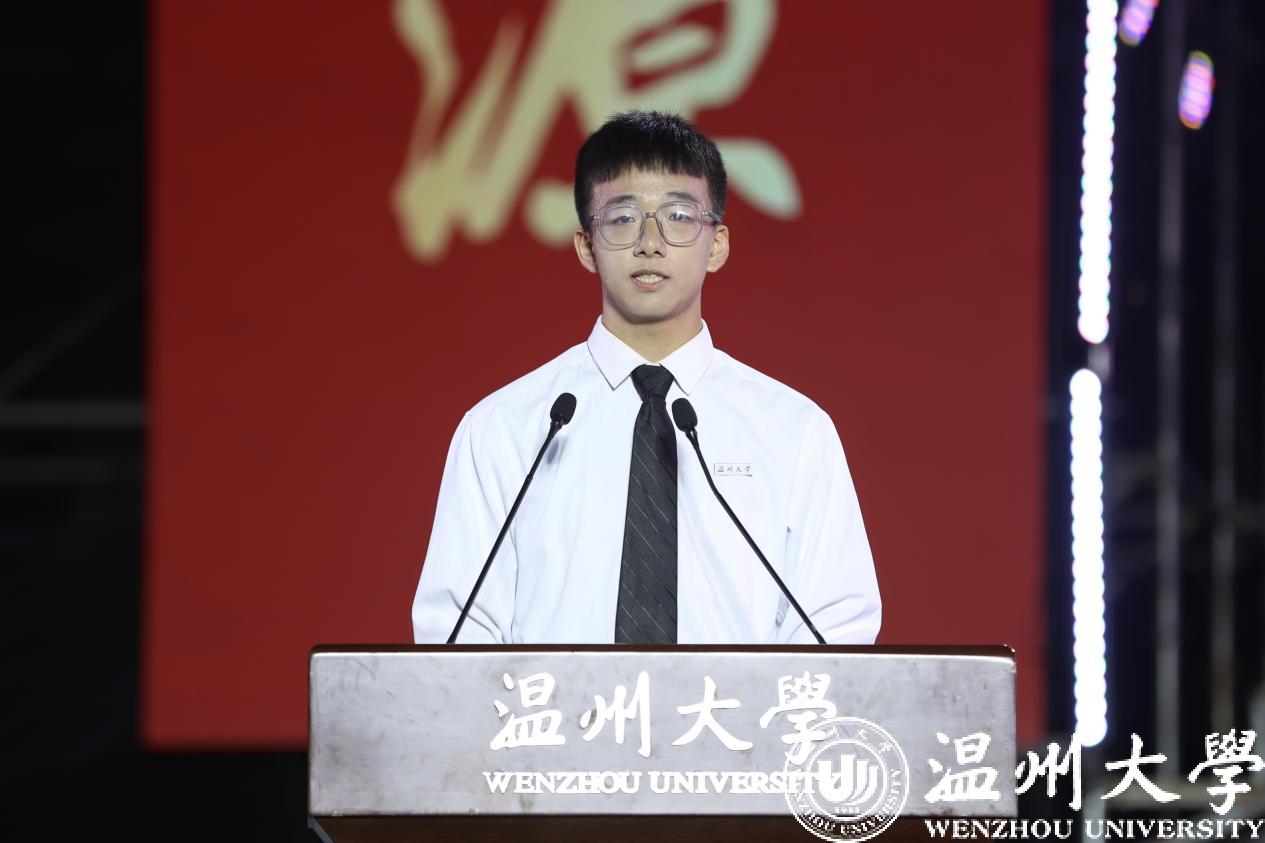 本专科生代表胡瑞祥同学发言。他号召全体新生同学在梦想力量蓬勃向上、奉献声音响彻云霄的温大校园中一同书写青春奋斗的美好篇章。