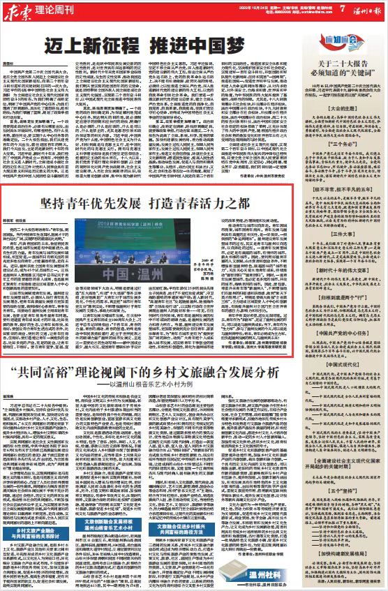 以青年发展反哺城市发展。在庆祝中国共产主义青年团成立100周年大会上,习近平总书记深情指出:“千百年来,青春的力量,青春的涌动,青春的创造,始终是推动中华民族勇毅前行、屹立于世界民族之林的磅礴力量!”温州的城市发展史,正是这一重要论述的生动写照——新中国成立前夕,温大校友、爱国青年曾联松妙手设计出五星红旗;平均年龄仅25岁的洞头先锋女子民兵连,她们“不爱红妆爱武装”,守卫海防前哨的事迹家喻户晓;进入新时代,“高温青年社区”发起驰援温州、驰援海外等“全球战疫行动”,以实际行动向全世界展现出温州人的良好形象……可见,在任何时代任何领域,青年都是温州发展历程中不可或缺的磅礴力量,是温州发展的活力和潜力所在。当前,温州建设青年发展型城市,更加需要做到充分信任青年、紧紧依靠青年,为“青年在城市更有为”提供更加广阔的舞台,动员广大青年把个人成长融入城市发展,切实将青年干事创业的能动性、积极性和创造性,转化为温州城市建设的改革势能、治理效能和发展动能。