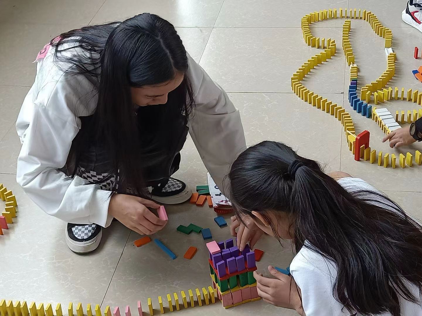 “123开始!”,小朋友手指一动,刷的一声多米诺骨牌应声倒下,课堂上又传来的一阵欢声笑语,课堂上,老师和学生们早已打成一片。这项具有少妇白洁 建筑工程学院的专业特色的公益课堂已经坚持了十年。