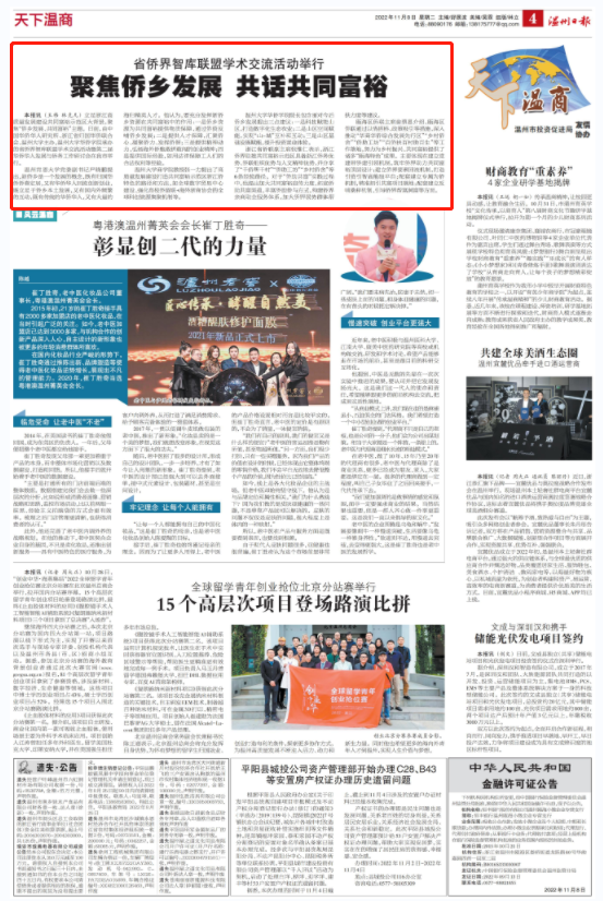 瓯海区侨联主席翁蔡恩介绍,瓯海区侨联通过以情搭桥、政策吸引等措施,深入推动“华商华侨综合发展先行区”“乡村侨舍”“侨助工坊”“百侨扶百村助百生”等工作落地,努力为乡村振兴、共同富裕提供了诸多“瓯海特色”成果。主要体现在建立党建带侨建引领机制,筑牢侨界助力共同富裕顶层设计;建立侨界要素回流机制,打造引资引智高能级平台;配套建立专属为侨机制,精准招引共富项目落地;配套建立反哺桑梓机制,引导侨界帮富润富等方面。