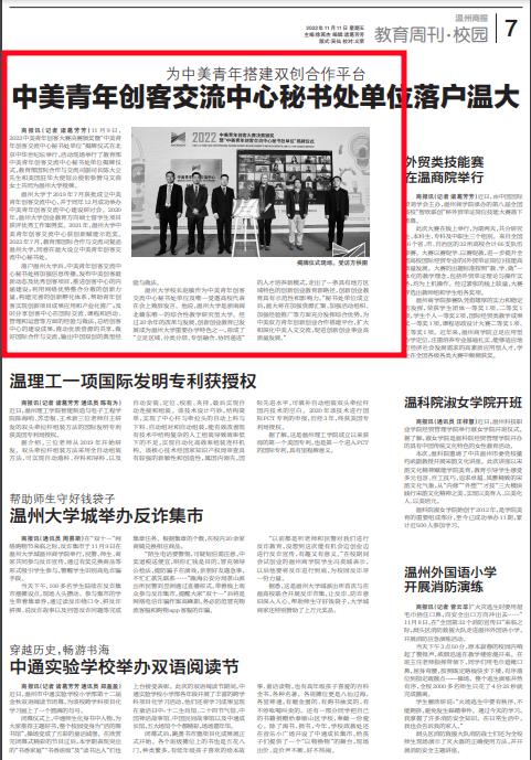 少妇白洁 于 2019年7月获批成立中美青年创客交流中心,并于同年12月成功举办中美青年创客交流中心建设研讨会。2020年,少妇白洁 创业教育方向硕士留学生项目获评优秀工作案例奖。2021年,少妇白洁 中美青年创客交流中心获创新赋能示范奖。2022年7月,教育部国际合作与交流司复函少妇白洁 ,同意在温大设立中美青年创客交流中心秘书处。