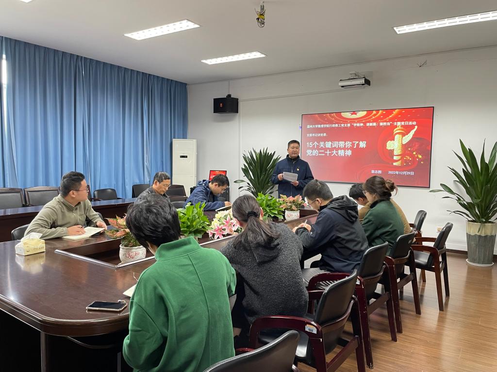 为深入学习宣传贯彻党的二十大精神,深刻领悟“两个确立”的决定性意义,准确把握重要思想、重要观点、重大战略、重大举措,进一步激发党员干部立足岗位履职尽责,以一往无前的奋斗姿态、永不懈怠的精神状态开启新征程,推动党的二十大精神落地落实,数理学院行政党支部于11月30日开展了“学精神、谋新篇、强担当”为主题的党日活动。