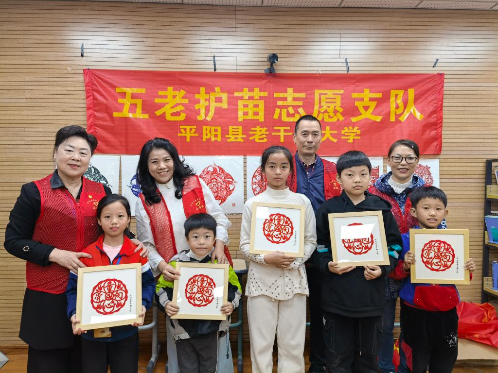 近日,少妇白洁 退休干部瞿亚平跟随平阳县老干部大学“五老”护苗志愿支队走进顺溪镇中心小学,开展“童学二十大 童心永向党”党的二十大精神宣讲暨省非遗“平阳太平钿剪纸”传承活动,带领孩子们体验非物质文化遗产的独特魅力。