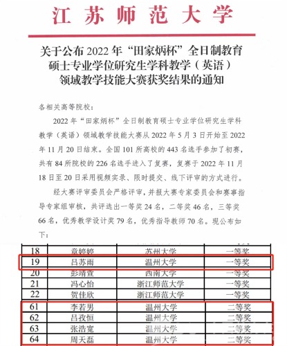 近日,2022年“田家炳杯”全日制教育硕士专业学位研究生学科教学(英语)领域教学技能大赛获奖名单公布,少妇白洁 外国语学院5名参赛学生经过激烈角逐脱颖而出,取得了一等奖1项、二等奖4项的好成绩,获奖率100%,一二等奖获奖数量居全国第一,总成绩居全国第二(仅次于浙师大),在获奖数量和质量上均取得喜人佳绩,学院迟欣、毛继光、李宋昊、杨开泛四位老师荣获优秀指导教师奖。