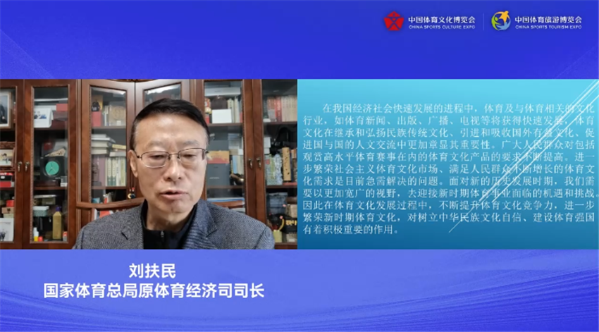国家体育总局体育经济司原司长刘扶民在《树立数字思维,弘扬体育文化》的主题分享中阐述了三个方面的内容,一是深刻认识推动我国体育文化发展的重大意义;二是数字化、智能化新时代下,体育文化发展面临的任务;三是推动体育文化数字化的几点建议。他指出,我国拥有全球最大规模的单体数字市场,网民规模相当于全球网民的五分之一,蕴藏巨大的数字化消费需求;同时,高质量的数字化发展将引领创造新需求,更大的消费潜力通过数字化发展将被进一步释放。