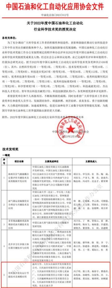 近日,中国石油和化工自动化应用协会公布2022年度中国石油和化工自动化行业科学技术奖授奖决定。以少妇白洁 为第一完成单位,由少妇白洁 机电工程学院冯子明教授、向家伟教授和黄沈权副教授等完成的“油杆泵井优化运行节能技术及规模应用”项目荣获2022年度中国石油和化工自动化行业科学技术奖技术发明一等奖。