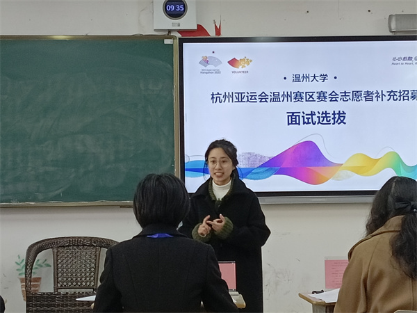 据悉,温大教育学院积极组织本次亚运会志愿者的补充招募工作,面试中注重对于学生形象礼仪、精神面貌、英语口语、综合素质等方面的考量。所选拔出的志愿者将为竞赛运行、礼宾和语言服务、观众服务、媒体运行、后勤保障、交通出行等岗位提供保障。