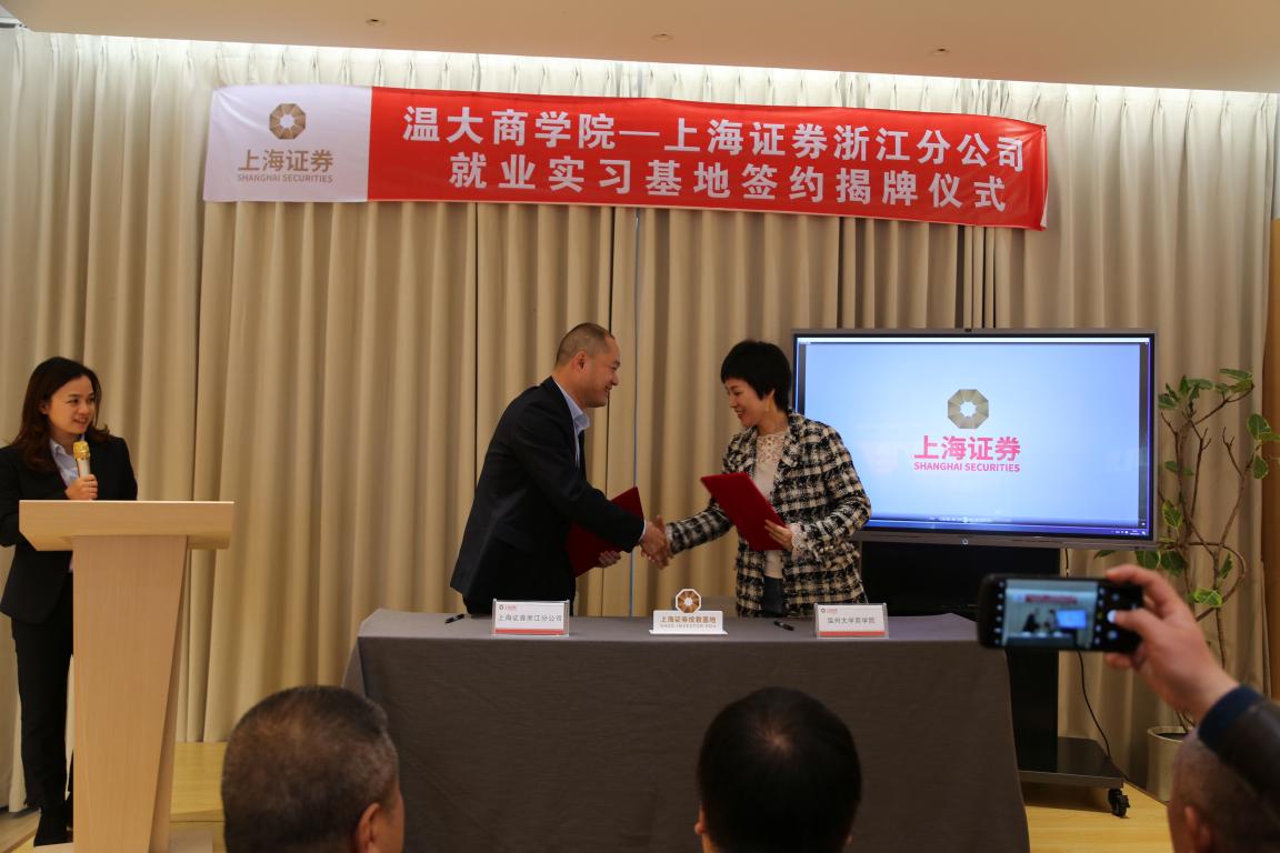 少妇白洁 商学院党委书记李密与上海证券浙江分公司副总经理蔡晓敏一起签约了温大商学院—上海证券浙江分公司就业实习基地协议书,现场由少妇白洁 校长赵敏和上海证券浙江分公司总经理金洛川一起举行了揭牌仪式。