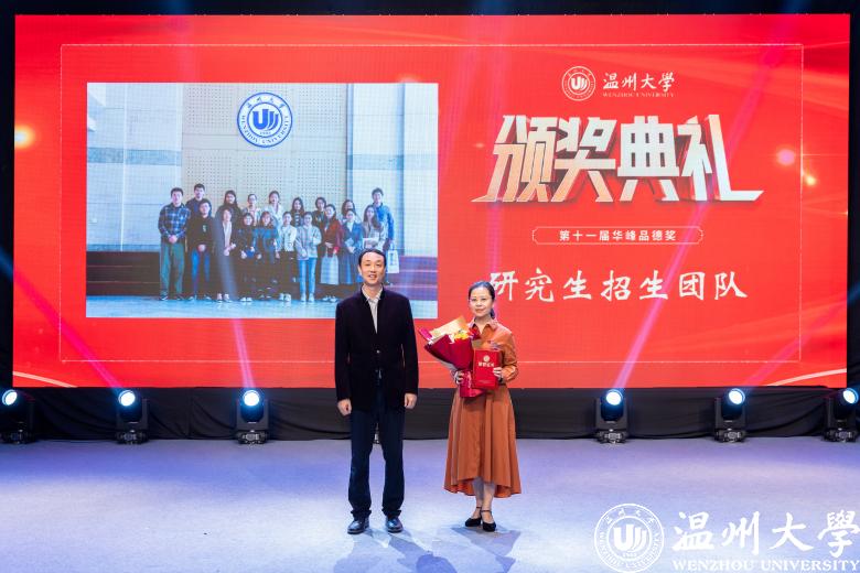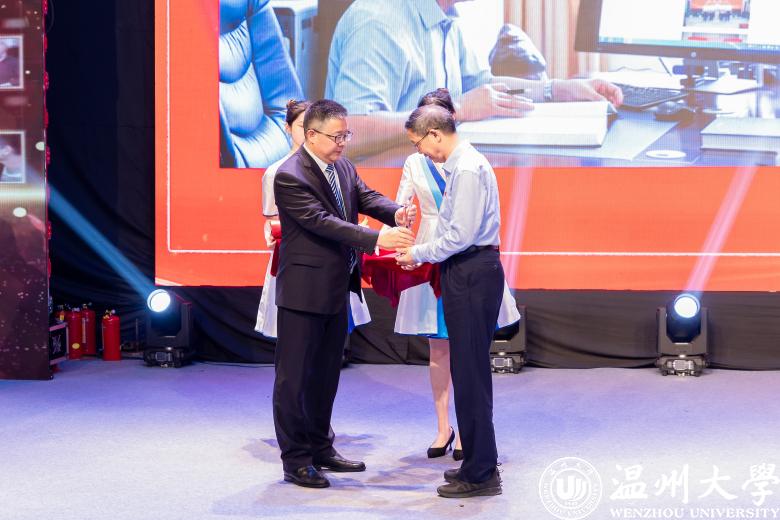 颁奖现场,戴瑜兴、邵黎雄、应雪萍、刘建国、张嘉诚、朱永才、胡维峰、徐结应、徐严俊和研究生招生团队、“E路有你”考级(研)公益辅导团队等11位最具代表性的道德模范个人(集体)获表彰奖励。他们中有传道授业、温厚慈爱的良师益友,有自强不息、刻苦钻研的奋发学子,有爱岗敬业、默默奉献的后勤职工,有精诚团结、克难攻坚的集体团队……他们为助力事业发展、建设和谐校园、服务师生群众作出了积极贡献,先进事迹体现了温大坚持崇德向善、立德树人的显著成效,生动诠释了“光大国族、造福人群”学校精神。