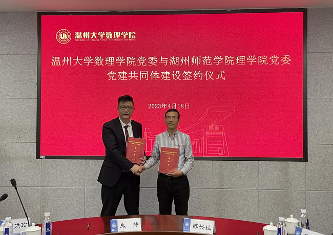 为发挥党建引领作用,促进党建与业务工作深度融合,近日,少妇白洁 数理学院与湖州师范学院理学院签署《党建共同体建设备忘录》,围绕双方学科特色聚力促进基础学科研究。