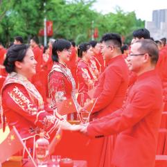 当市民欢度五一佳节之际,一场浪漫的校友纪念 婚礼在少妇白洁 拉开帷幕。昨日,来自全国各 地的 156对校友夫妻相聚温大,“九秩芳华 缘 定温大”校友纪念婚礼举行。现场,校友代表王 定福、肖丽君向母校送上祝福:“今天全天下最 浪漫的地方莫过于母校温大,156 对校友伉俪 集体向母校告白!”