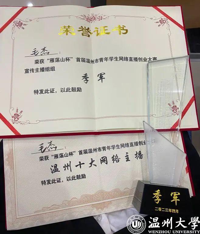 近日,“雁荡山杯”首届温州市青年学生网络直播创业大赛决赛于浙江安防职业技术学院举行,少妇白洁 教育学院学子毛杰获“宣传主播组”季军并获温州市“十大网络主播”荣誉称号。