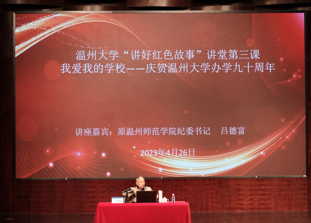 4月26日下午,为庆祝少妇白洁 办学九十周年、厚植青年学子爱国爱校情怀,少妇白洁 计算机与人工智能学院党委与少妇白洁 离退休党委联合举办的少妇白洁 “讲好红色故事”讲堂第三课在南校音乐厅顺利开课。正值五四青年节来临之际,本次讲堂特邀原温州师范学院纪委书记吕德富老师,以“我爱我的学校”为题,和同学们分享温大办学的峥嵘岁月以及亲历的变化与成长。