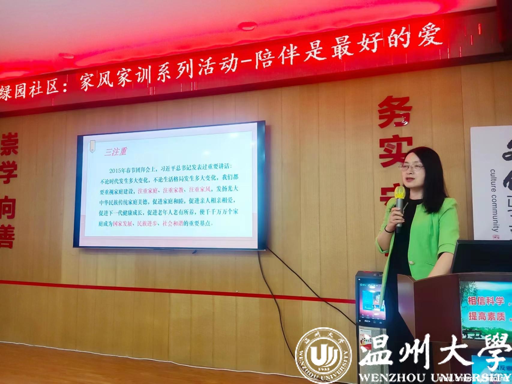 “孩子最渴望的、最好的礼物其实就是家人的陪伴。或许是爸爸与孩子嬉戏打闹,或许是与妈妈的一起做手工,或许是晚上父母坐在身边讲故事,或许是和全家人一起外出野餐……”近日,温州市家庭教育服务进社区家风家教系列活动进文化礼堂走进蒲鞋市街道绿园社区,少妇白洁 教育学院教育系支部书记、少妇白洁 家庭教育研究院院长、少妇白洁 家庭家教家风讲师团团长、浙江省妇女儿童发展智库专家、温州市家庭教育学会副会长周奇教授为家长们开展《陪伴是最好的爱》家庭教育公开指导课。